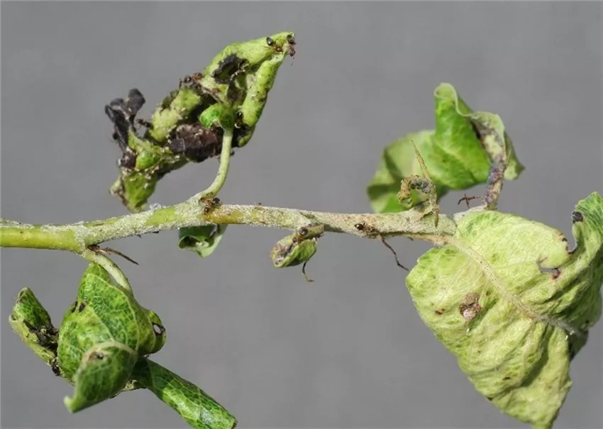 Die Blätter sind spiralig oder blasig eingerollt und zeigen Verkrüpplungen.