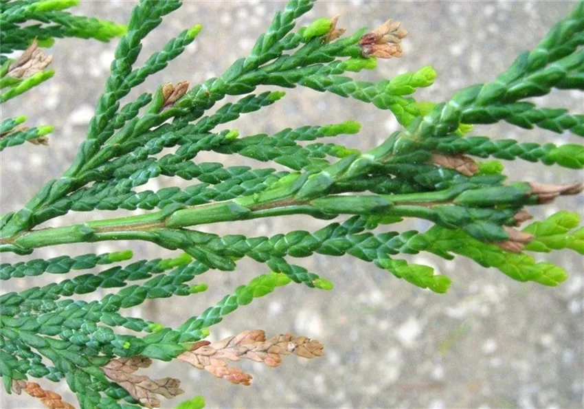 Die Triebspitzen von Scheinzypressen (Chamaecyparis) sind braun verfärbt. Bei genauerer Untersuchung kann man feststellen, dass die geschädigten Zweigspitzen innen hohl gefressen und mit schwarzen Kotkrümelchen gefüllt sind.