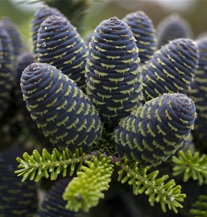 Besonders dekorativ sind die dunkelbraunen, zylindrischen Zapfen von Abies koreana. Diese erscheinen ab Oktober.Die jungen Zapfen haben eine dunkelblaue Färbung.
